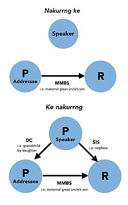 In Bininj Kunwok,[6] for example, the bi-relational kin-term nakurrng is differentiated from its tri-relational counterpart by the position of the possessive pronoun ke. When nakurrng is anchored to the addressee with ke in the second position, it simply means ‘brother’ (which includes a broader set of relations than in English). When the ke is fronted, however, the term nakurrng now incorporates the male speaker as a propositus (P i.e. point of reference for a kin-relation) and encapsulates the entire relationship as follows:
