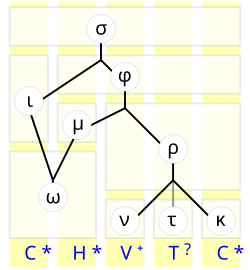 • Onset (ω): A consonant or consonant cluster, obligatory in some languages, optional or even restricted in others
